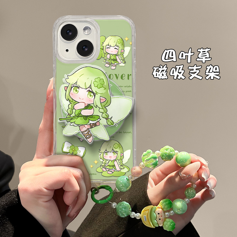 クローバーの女の子の磁気吸引スタンドはリンゴ13promax携帯電話ケース15透明シリコンゴム14かわいいブレスレットを適用します