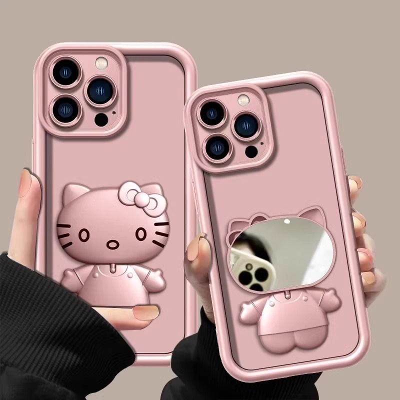 ピンクの猫の鏡はiphone16アップルの携帯ケース15フロストシリコン14かわいい13proストラップxを適用しています
