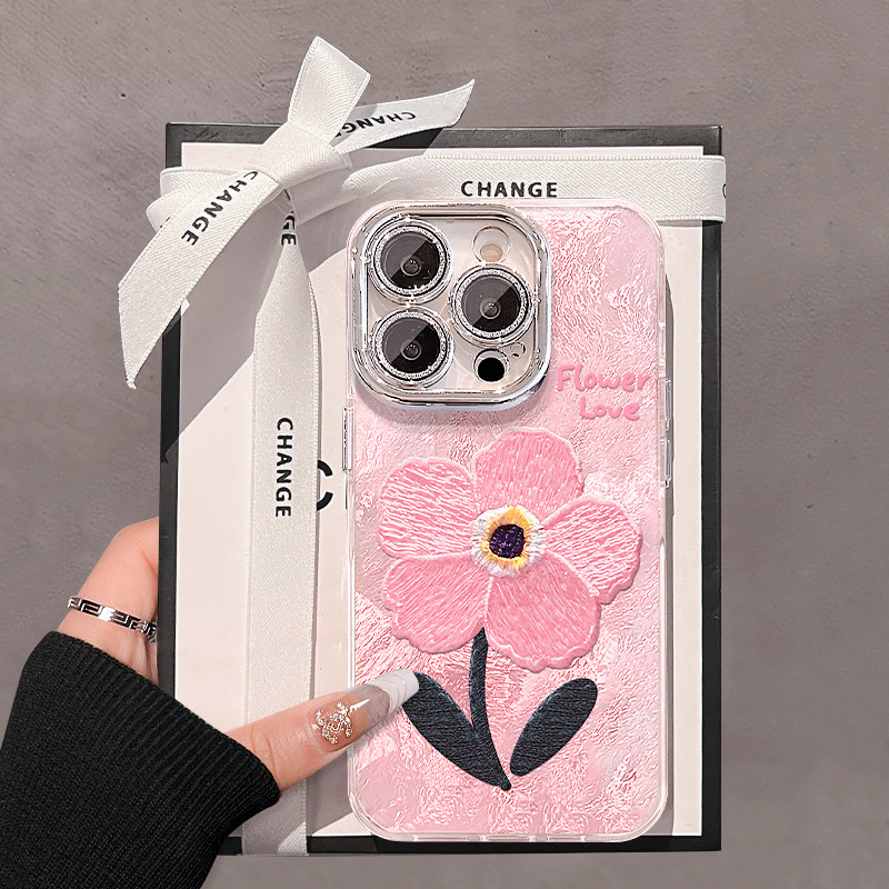 ピンクの刺繍花はアップル16pro携帯ケースiphone15春夏新作14高級感13/12を適用します。