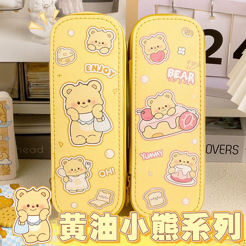 バター熊二重筆袋高颜値漫画かわいい文房具袋児童学生大容量皮質鉛筆ケース