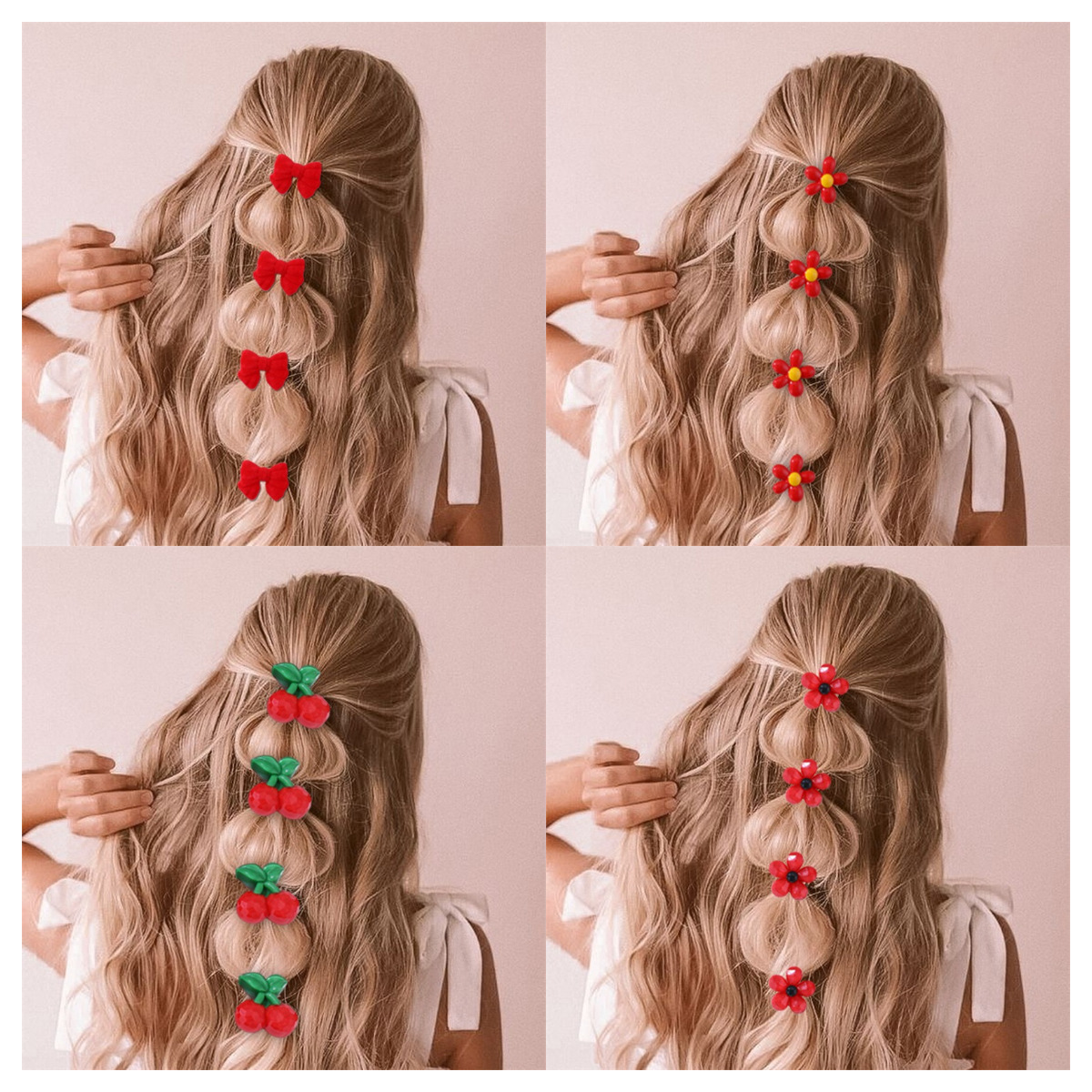 韓国系の赤いキャンディーの花の頭飾りカモの口は後頭部の蝶結びの半分の髪の側の前髪を挟んで女性の髪飾りを挟みます。