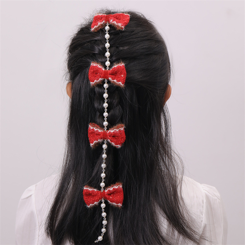 悦珊クロスボーダーの新型髪飾りかわいい赤い蝶結びの白い花の真珠のフリンジチェーンの子供の頭の後ろのヘアピン