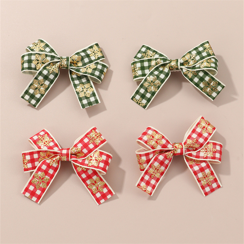 欧米のクリスマスシリーズの髪飾りはシンプルで清新な方眼赤緑色の蝶結び雪模様の子供用ヘアピンです。