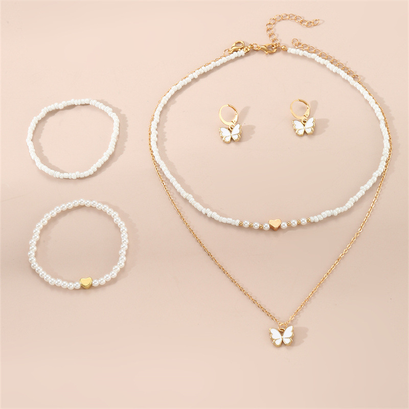 クロスボーダー新作ジュエリー白ベージュハート手作りビーズ蝶ペンダント子供ネックレスブレスレットイヤリングセット