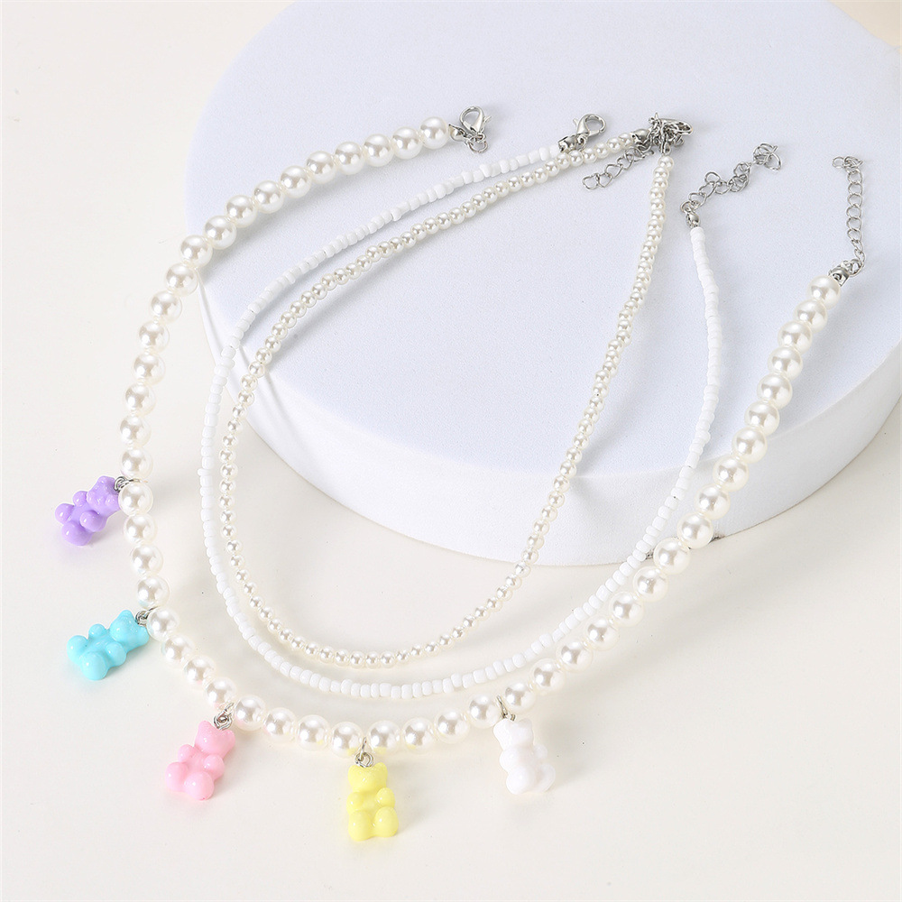 Ysn1450クロスボーダー可爱いカラーベアペンダント白パールベージュ手作りビーズ子供用ネックレスセット