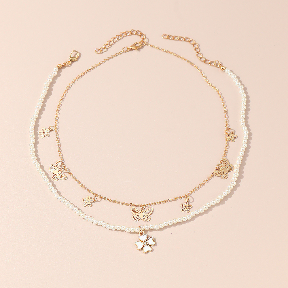 国境を越えた欧米の新型児童四葉草蝶ビーズ金属ネックレス2点セットの女性小衆デザイン感首飾り