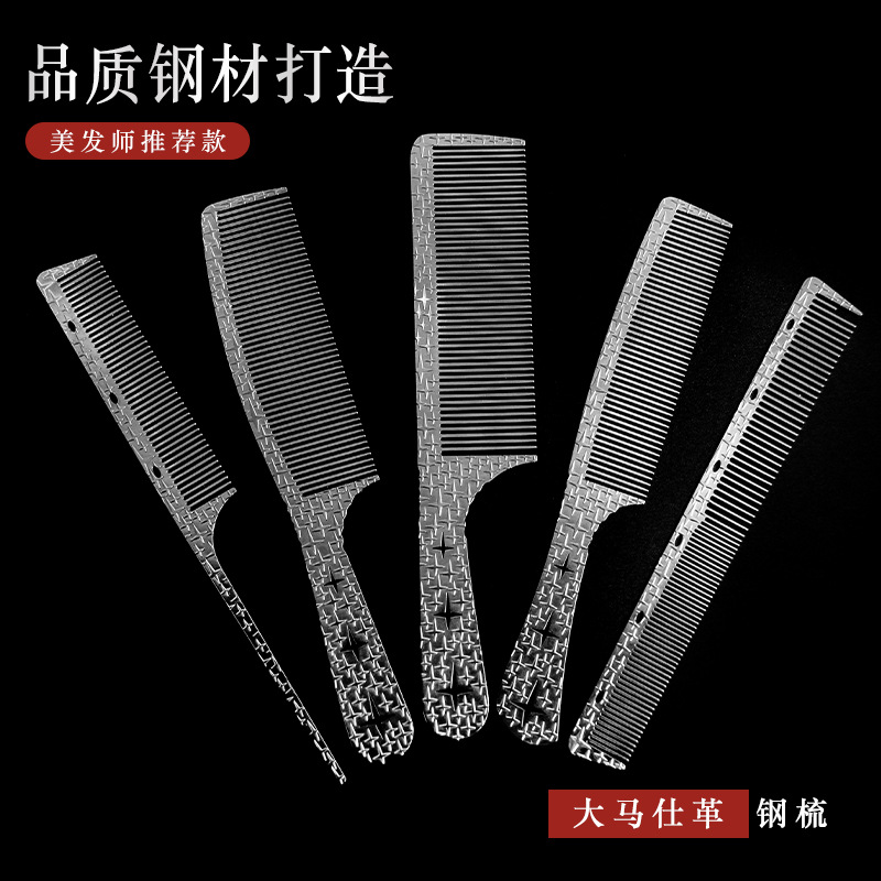 メーカー直供ダマスカス銀色鋼櫛静電気防止金ステンレスカット櫛精品レリーフ櫛