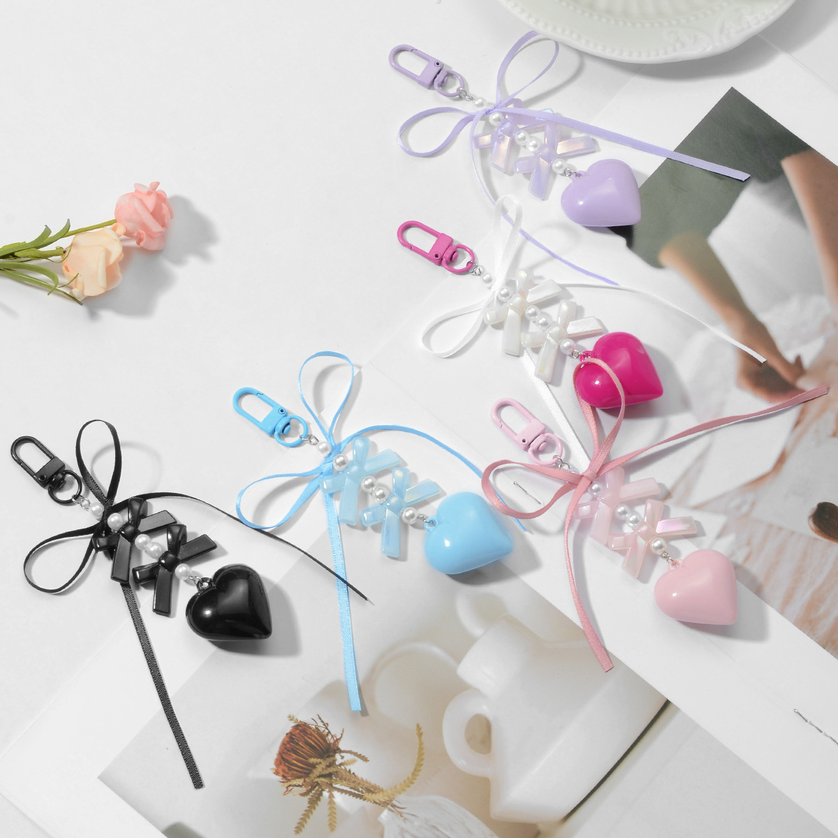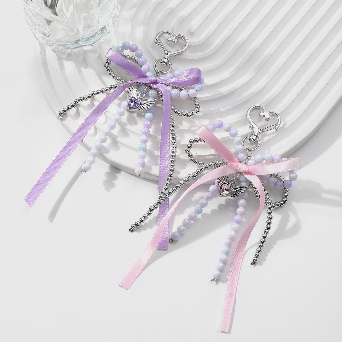 国境を越えて起爆したins韓系甘いファッション手作りビーズCCB米珠リボン翼心キーホルダー