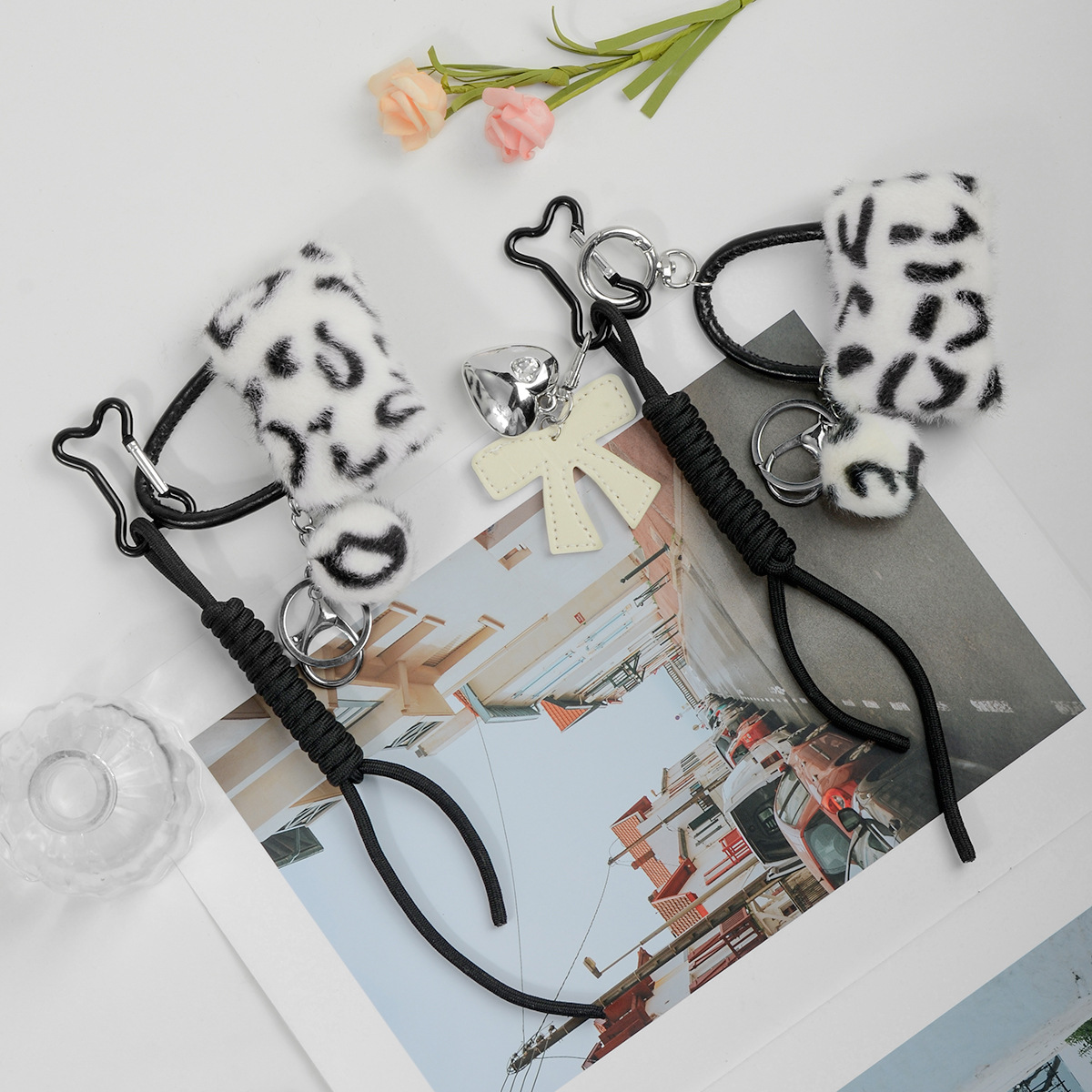 国境を越えた起爆金y 2k個性的で洗練された暗黒豹紋毛玉皮革アクリル蝶ネクタイ吊り紐DIYキーホルダー