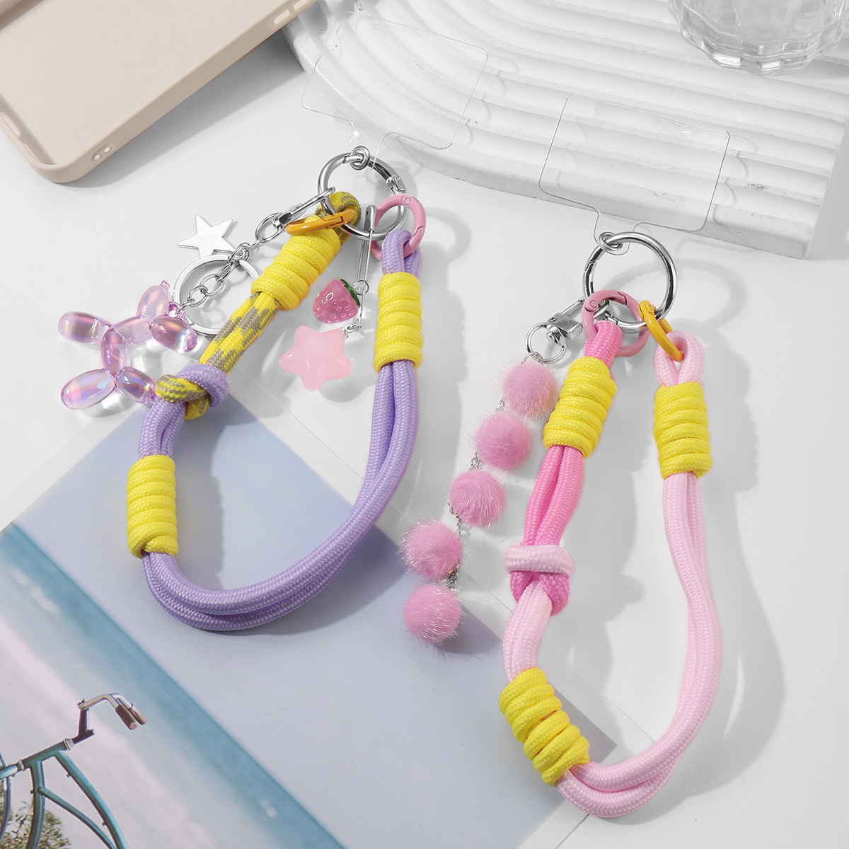クロスボーダー爆金insかわいい少女超仙ピンク毛玉子犬星いちご色吊り紐キーホルダー