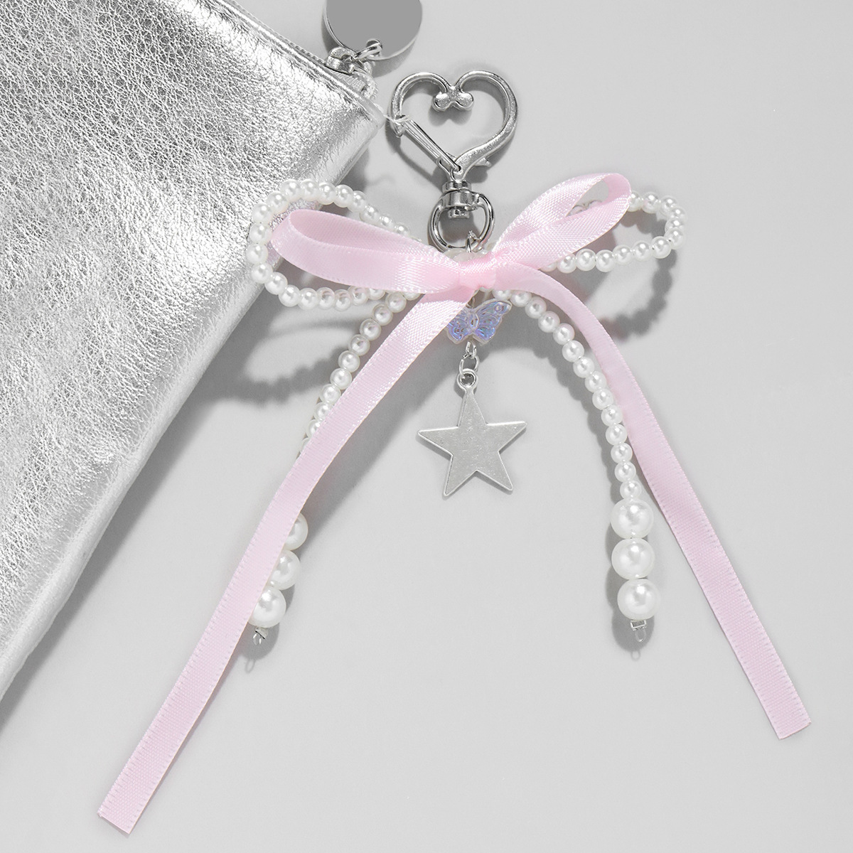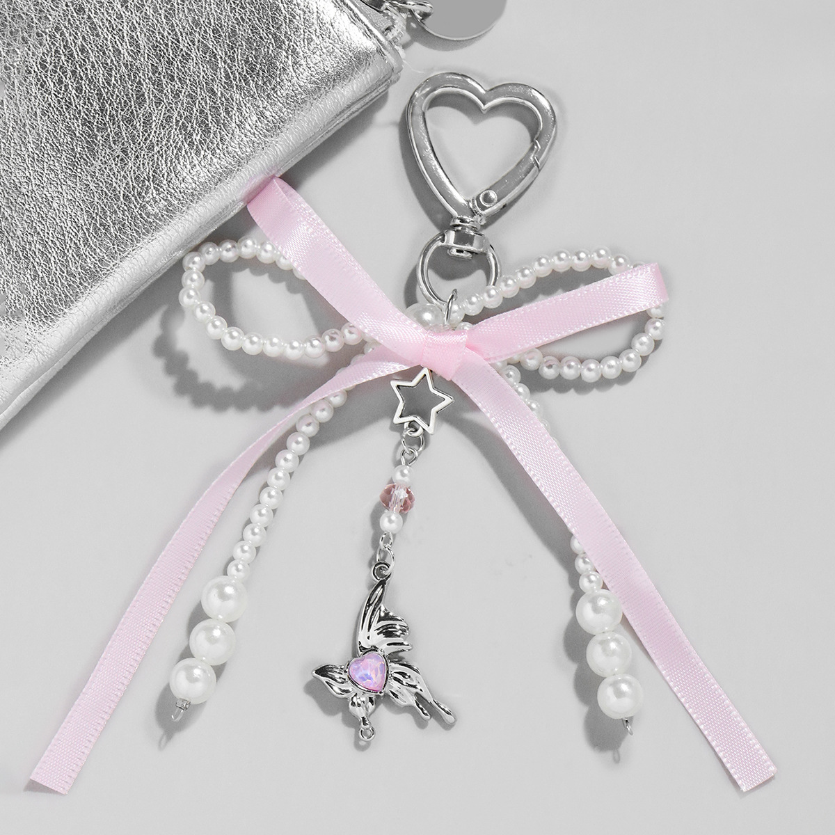 国境を越えた爆発金は甘くておしゃれなピンクのリボンは真珠の蝶結びの星に似せて水晶のペンダントのキーホルダーに似せます。
