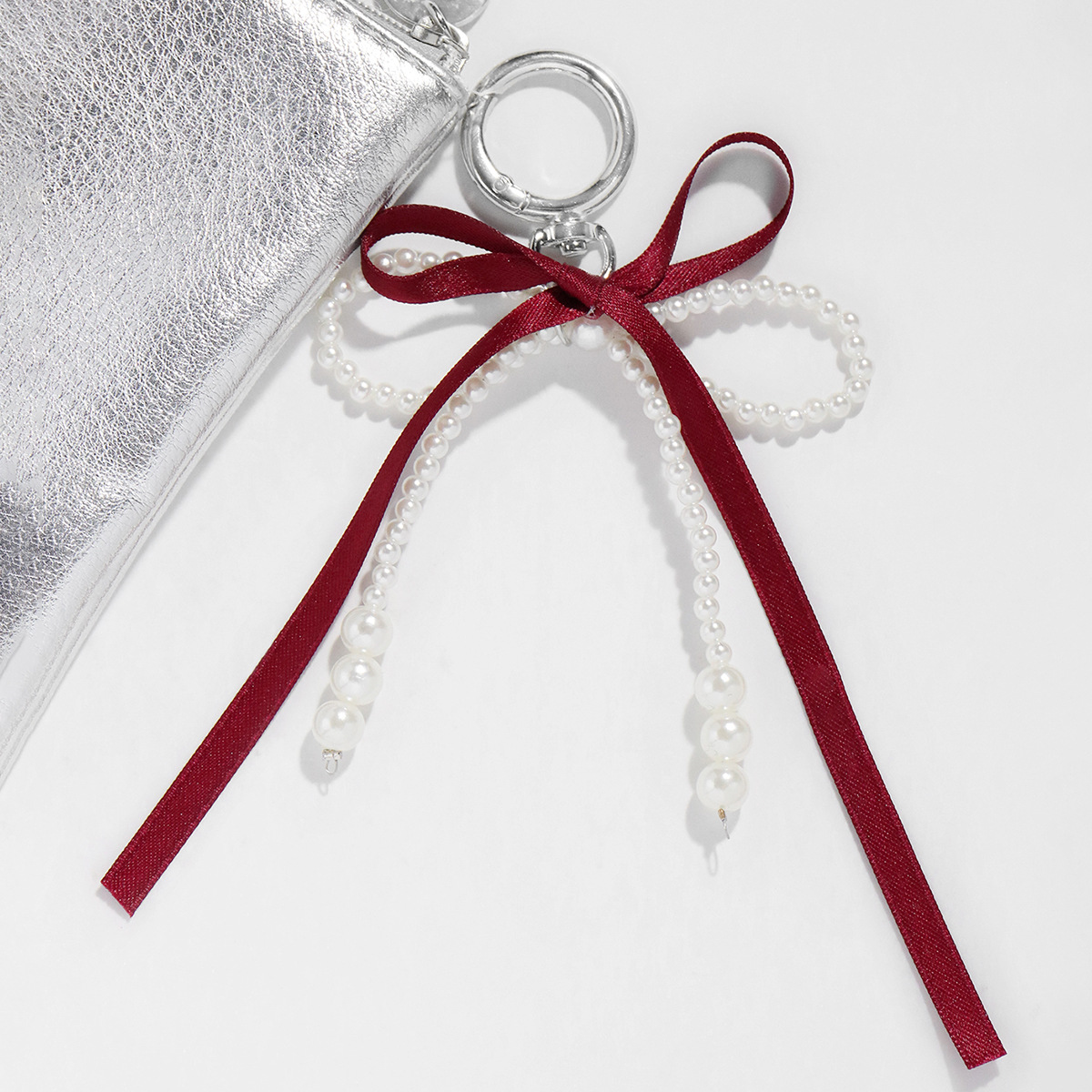 国境を越えた爆発物ins甘いクールなファッションシンプルなワインレッドのリボンは真珠の蝶ネクタイのキーホルダーのストラップに似せている