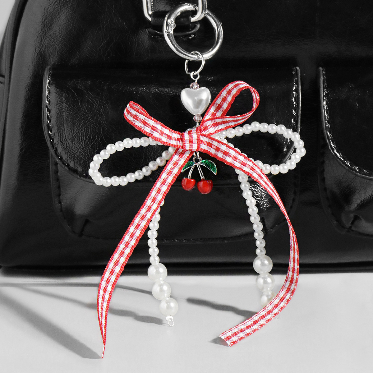 クロスボーダーの爆発金はシンプルで甘美で清新な手作りのビーズの白い模造真珠の2色の格子の蝶結びのキーホルダーです。