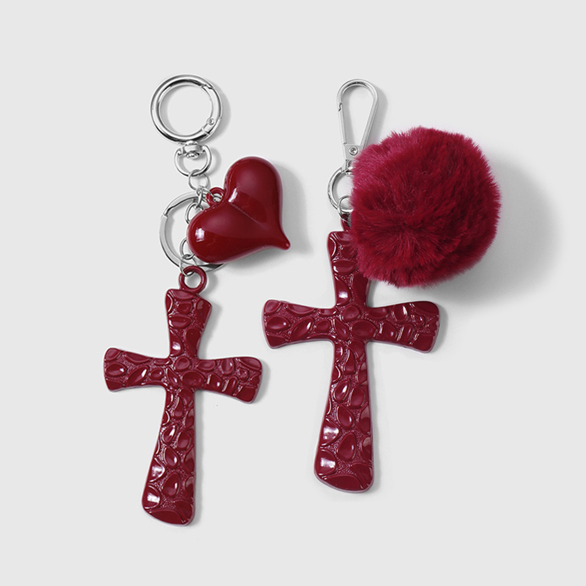 新しい y2k 甘くてクールなレトロなダークスタイルワインレッドパターンクロスファーボールラブ DIY キーホルダーバッグペンダント