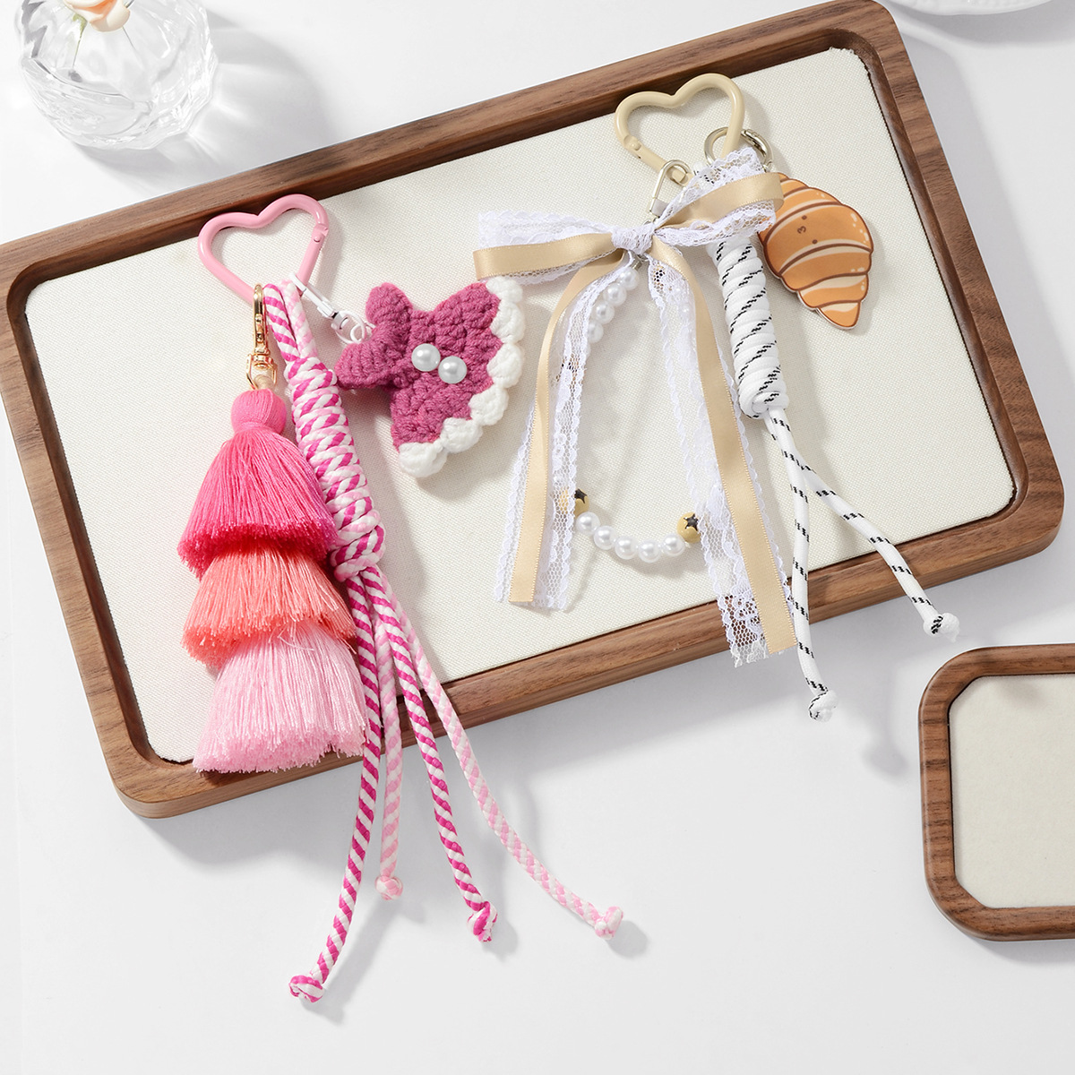 新しいイン絶妙なレトロな甘いタッセルかぎ針編みスカートアクリルクロワッサンミラー DIY キーホルダー