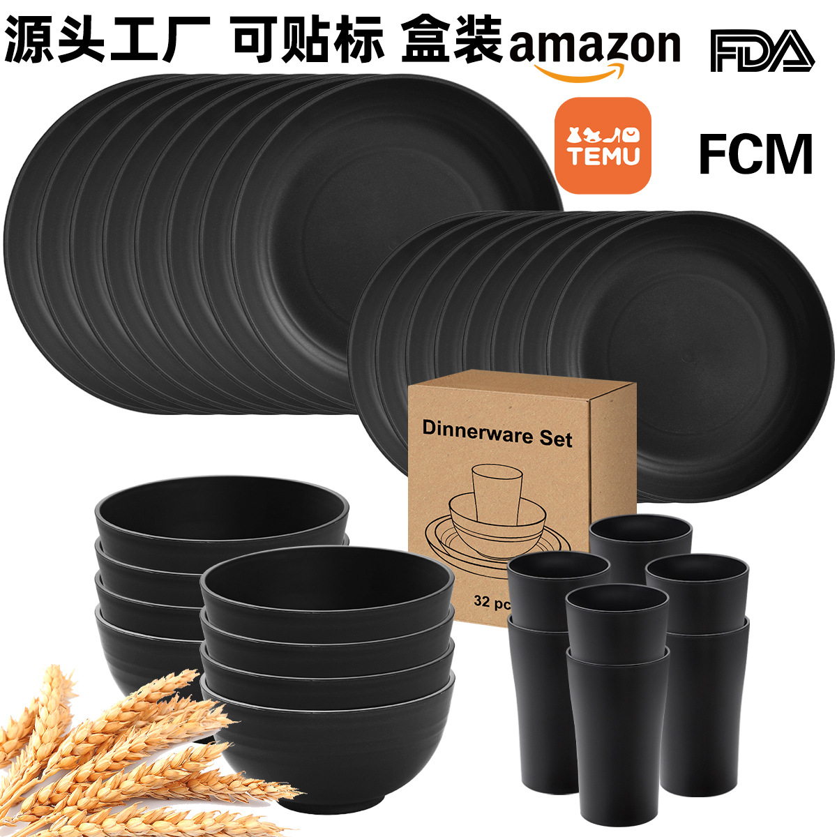 国境を越えた人気の小麦わら黒ボウル、皿、カップ 32 ピース食器セット家庭用プラスチック pp 厚みのあるプレートとボウル