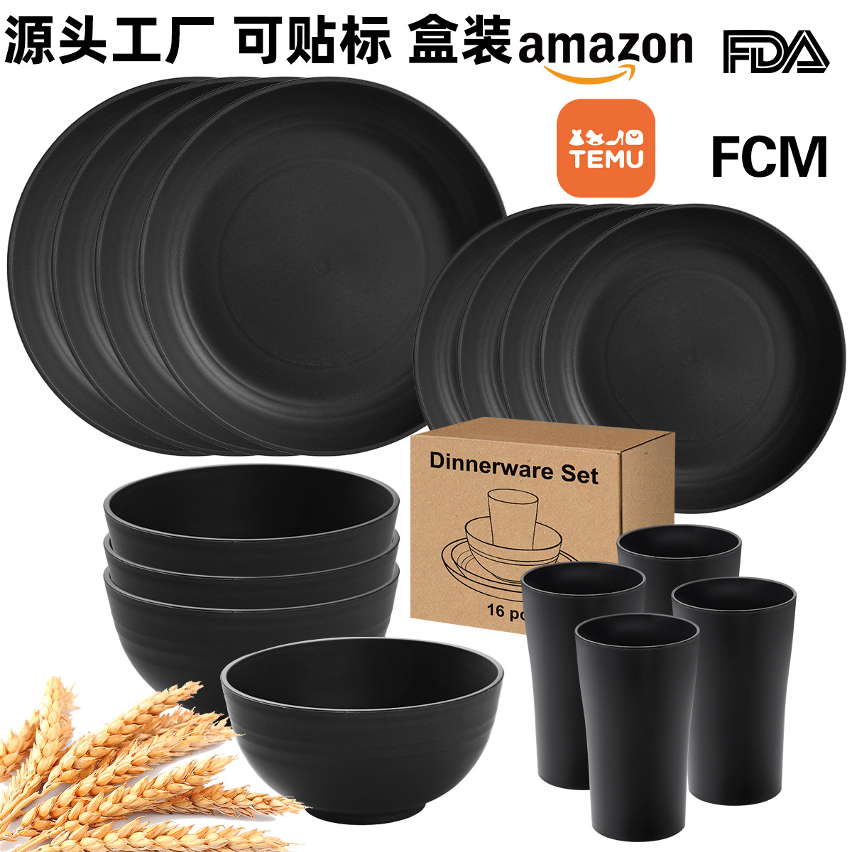 国境を越えた小麦わら皿杯16点セット食器セット家庭用ppプラスチック皿