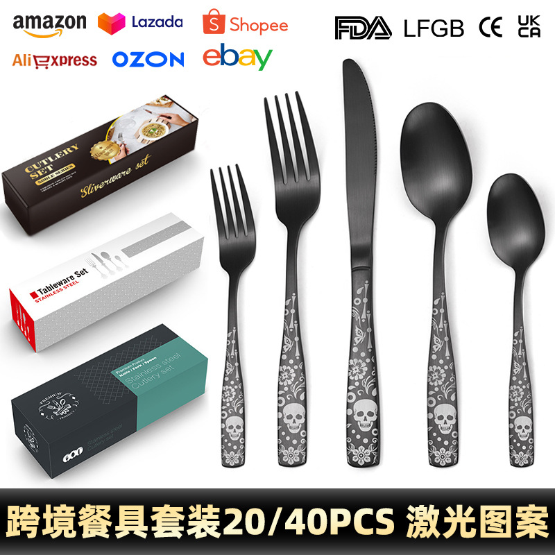 アマゾンステンレス食器セットスカル柄家庭用ホテル洋食ステーキナイフフォークスプーン20/40点セット