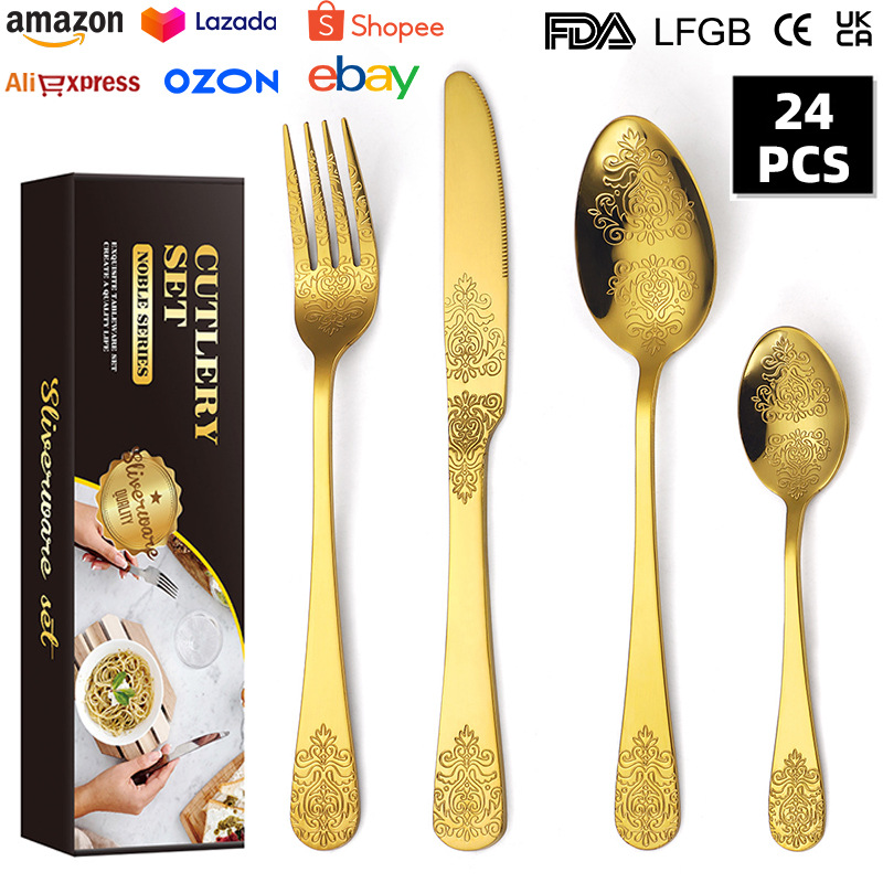 国境を越えた双頭模様のステンレス食器24点セット家庭用ホテルステーキナイフフォークスプーンセット創意彫刻花