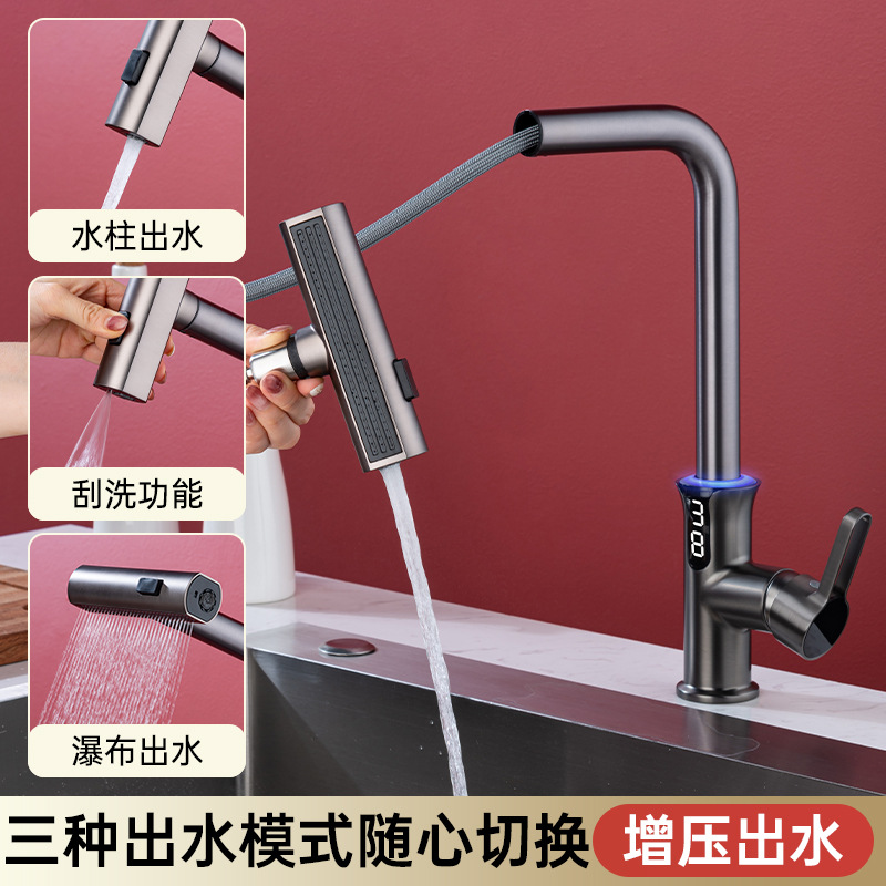 銃の灰色の雨の滝の蛇口の引き出し式のトイレの洗面所の洗面台の下の洗面器の全銅の冷熱の蛇口