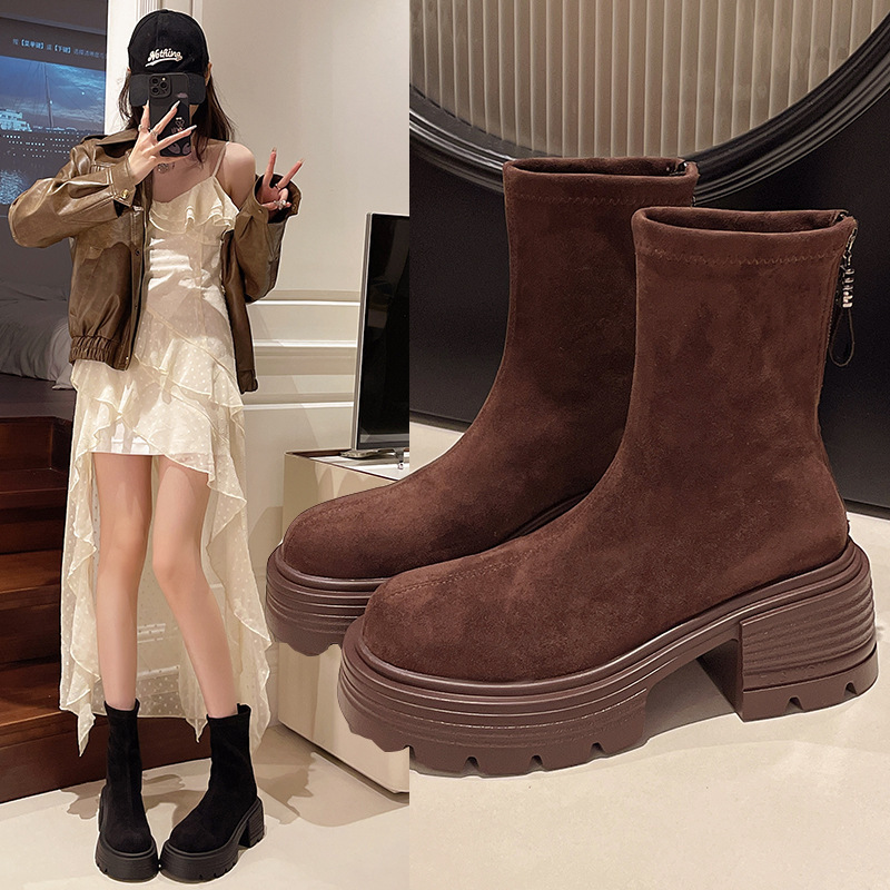 2024冬の新型英倫風牛反絨短筒痩せブーツファッションフランス後ファスナー太さとショートブーツ女