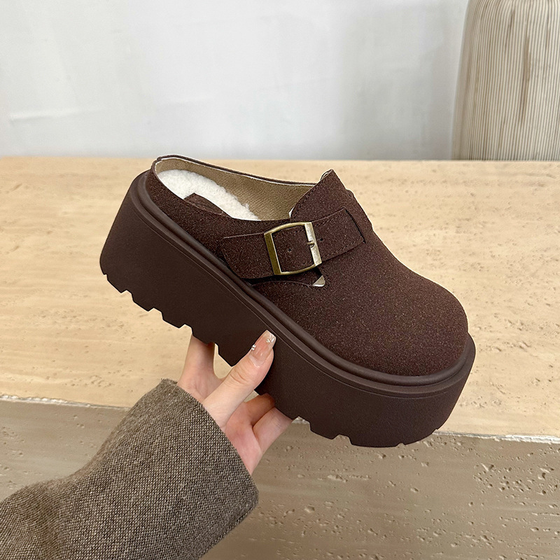松餅の厚い底にベルベットをつけてスリッパを漕ぐ女性は2024年冬の新英倫風怠け者の包頭半スリッパを履いている