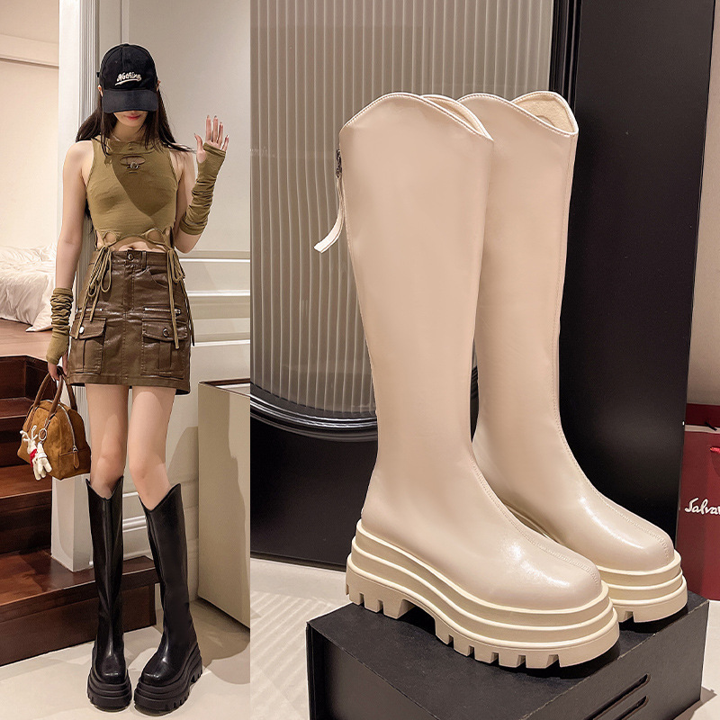 秋冬の松の餅の厚い底の長い筒のブーツのマーティンの靴はひざを過ぎません。