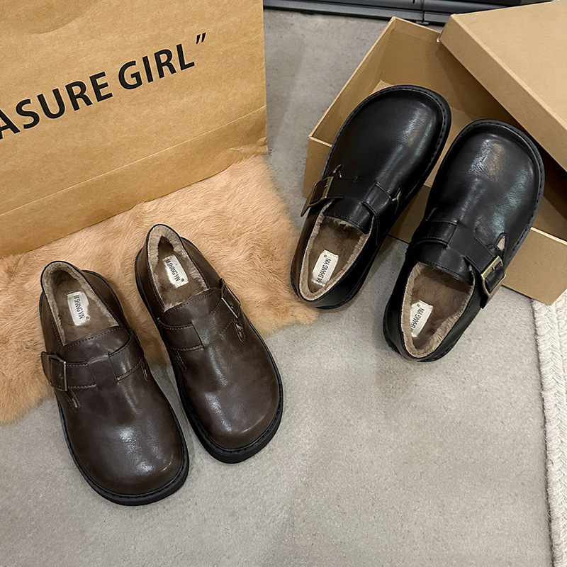 レトロな全包ストラップの厚い底のベーケンの靴の女性の2024の新型の秋冬の高くなるベルベットの毛の滑り止めの綿の靴