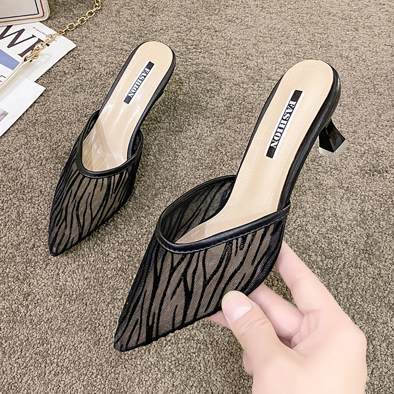 外国貿易の包頭の半スリッパの女性の2024夏の新型の先端の外はスリッパのハイヒールの女性の細い靴とレースの冷たいスリッパを着ます。