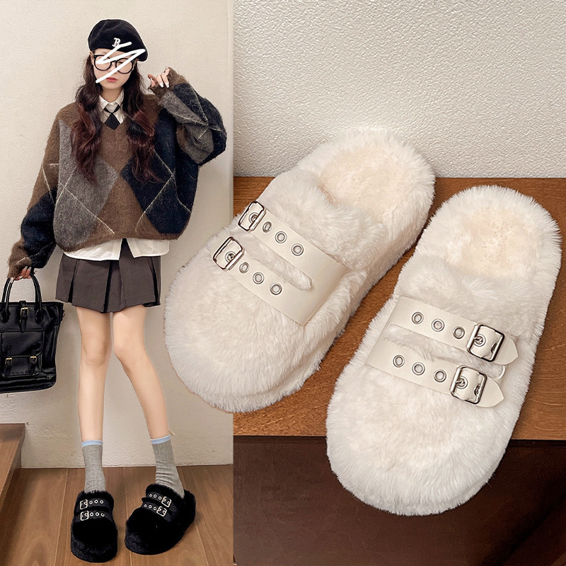 包頭毛羽スリッパの女性は2023年の新型秋冬小衆高級感ファッションベルトバックルを着て綿引きを高めた
