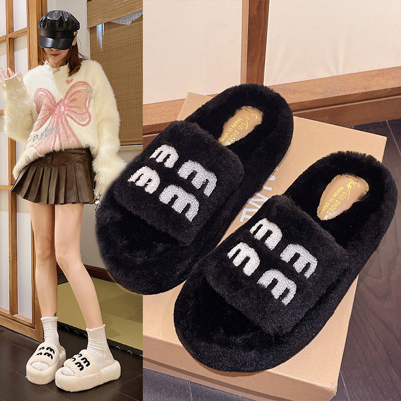 厚い底の毛のスリッパの女性の秋冬の2024新型のファッションネットの赤い1字の綿は毛の足の高さの毛の靴を引き延ばします。