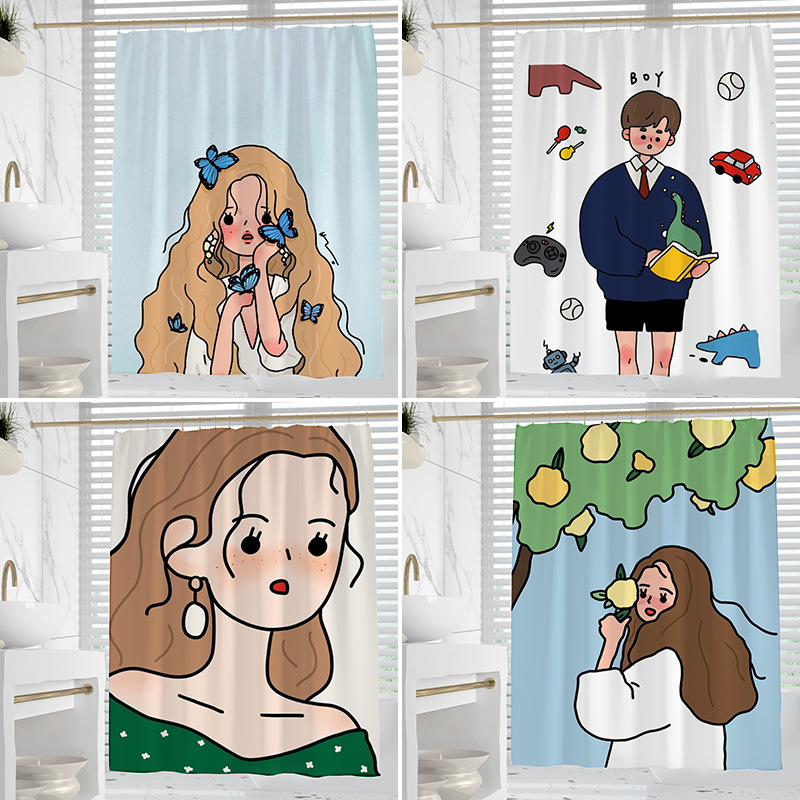 アマゾンクロスボーダー防水シャワーカーテン防カビ厚手ポリエステル韓国イラスト浴室トイレ風呂仕切りカーテン