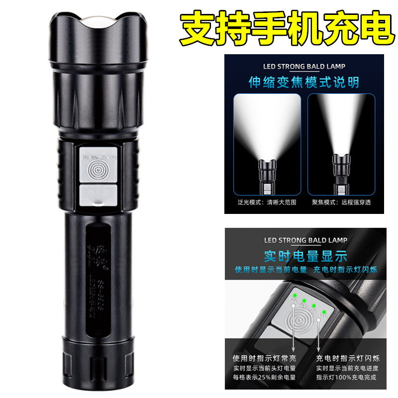 クロスボーダー専用外国貿易ABS懐中電灯強光多機能伸縮ズームフォーカスUSB出力5v充電可能携帯電話