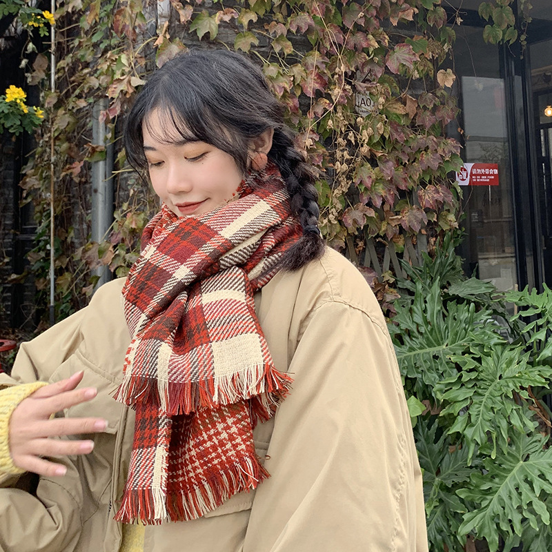 日本のマフラーの女性冬のinsかわいい学生は、カシミヤのマフラーの赤い格子のマントを厚くします。