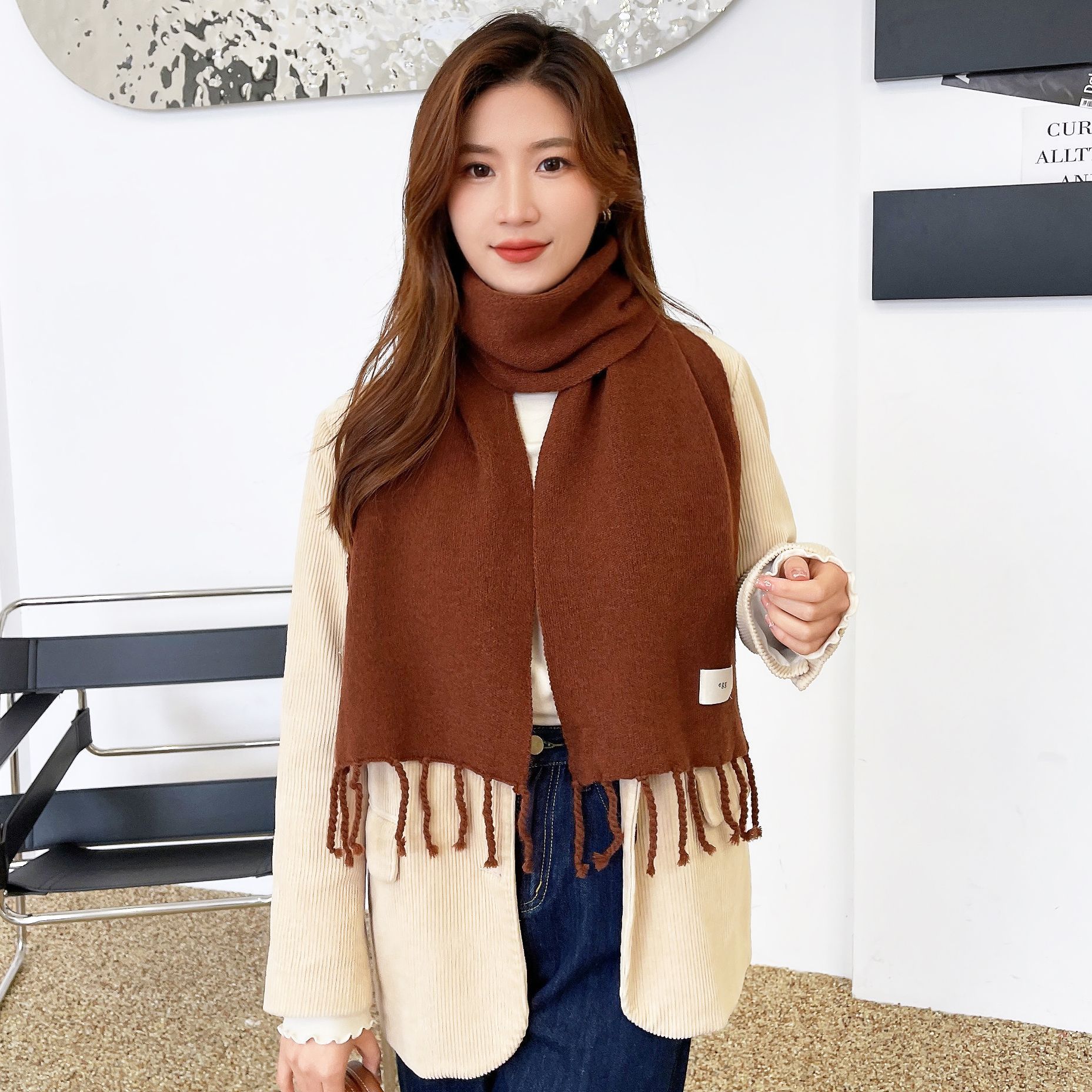 日系2021新型純色ソフトコットンお下げマフラー女性冬百合insかわいい学生保温マフラー