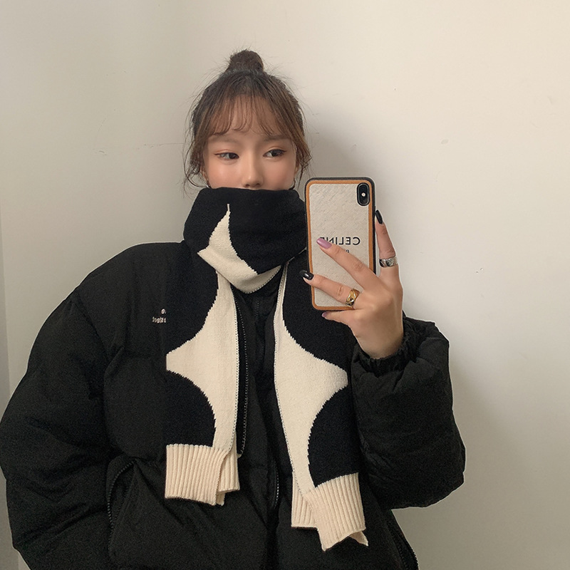 白黒両面ボール衝突色マフラー女性冬ストール両用韓国版百合学生保温ニットマフラー