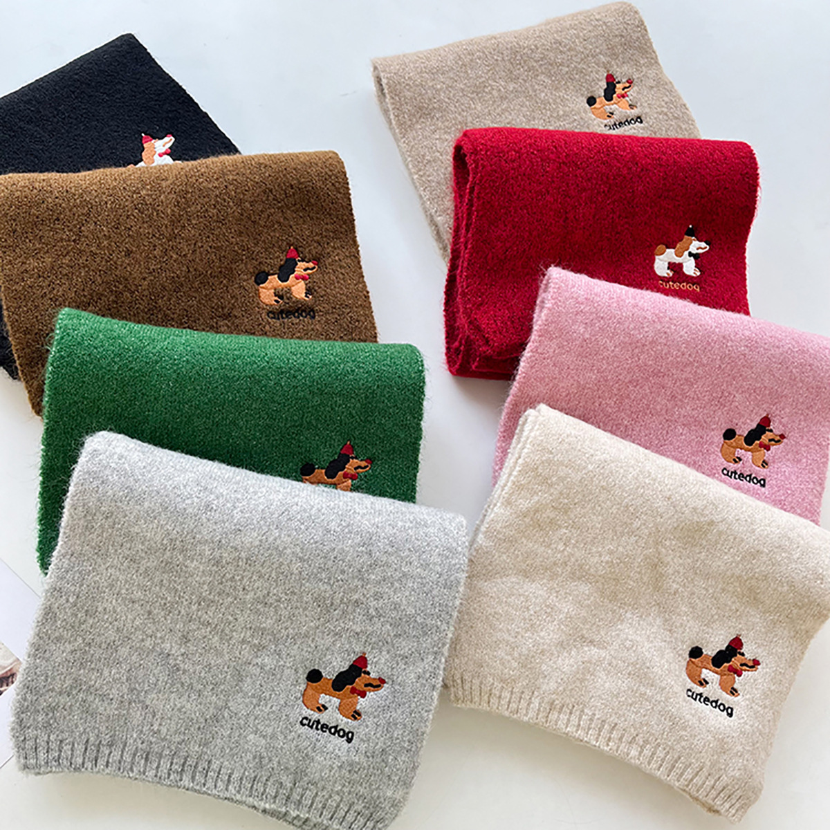 かわいい子犬の刺繍のニットのマフラーの女性の秋冬の保温の2024の新型の百合の純色のinsは首の学生の潮を囲みます。
