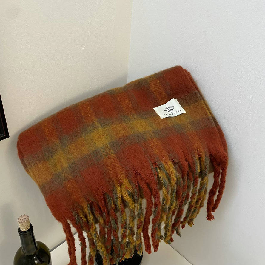 新型レトロ紅葉赤格子馬海毛マフラー女性冬保温カップル雰囲気感マフラー欧米