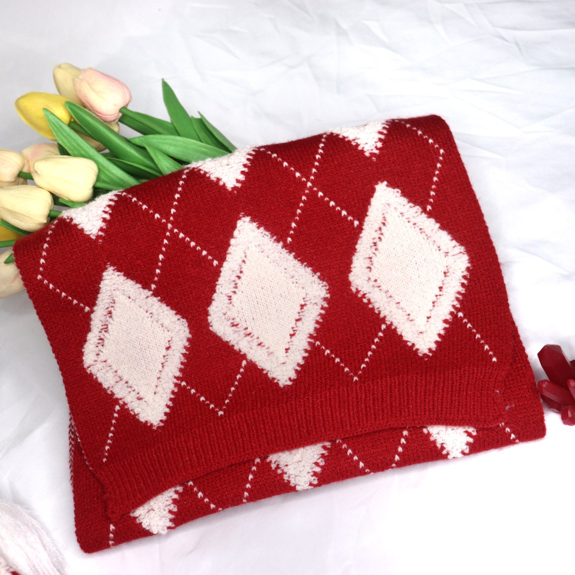 赤いひし形の格子のニットのマフラーの女性の冬の韓国版のinsは組み合わせて首を囲んで保温します。