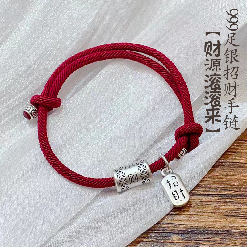 S999足銀財源こつるブレスレットレトロ純銀招財手縄本命年編み赤縄カップル銀手飾り