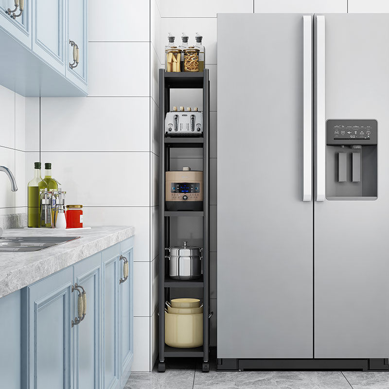 台所の隙間の棚の挟みの円管の輪の床置き式の多層の雑物の収納棚の狭い辺の棚の側の鉄の棚