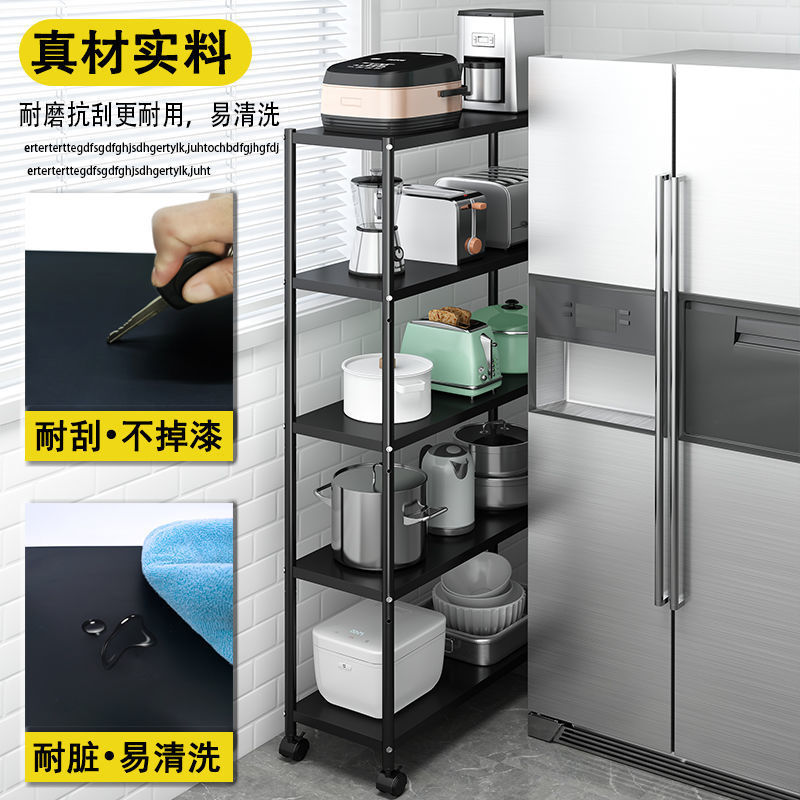 キッチンの隙間に物を置く棚ステンレスの隙間に床に入る多層の移動可能家庭用冷蔵庫の横にある狭い収納鍋棚