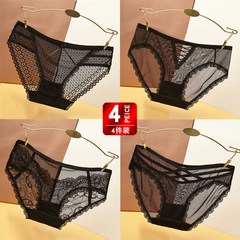 レース三角パンツ2/4本の軽贅沢黒ファッションセクシー透明女性下着低腰透かしなし綿股女