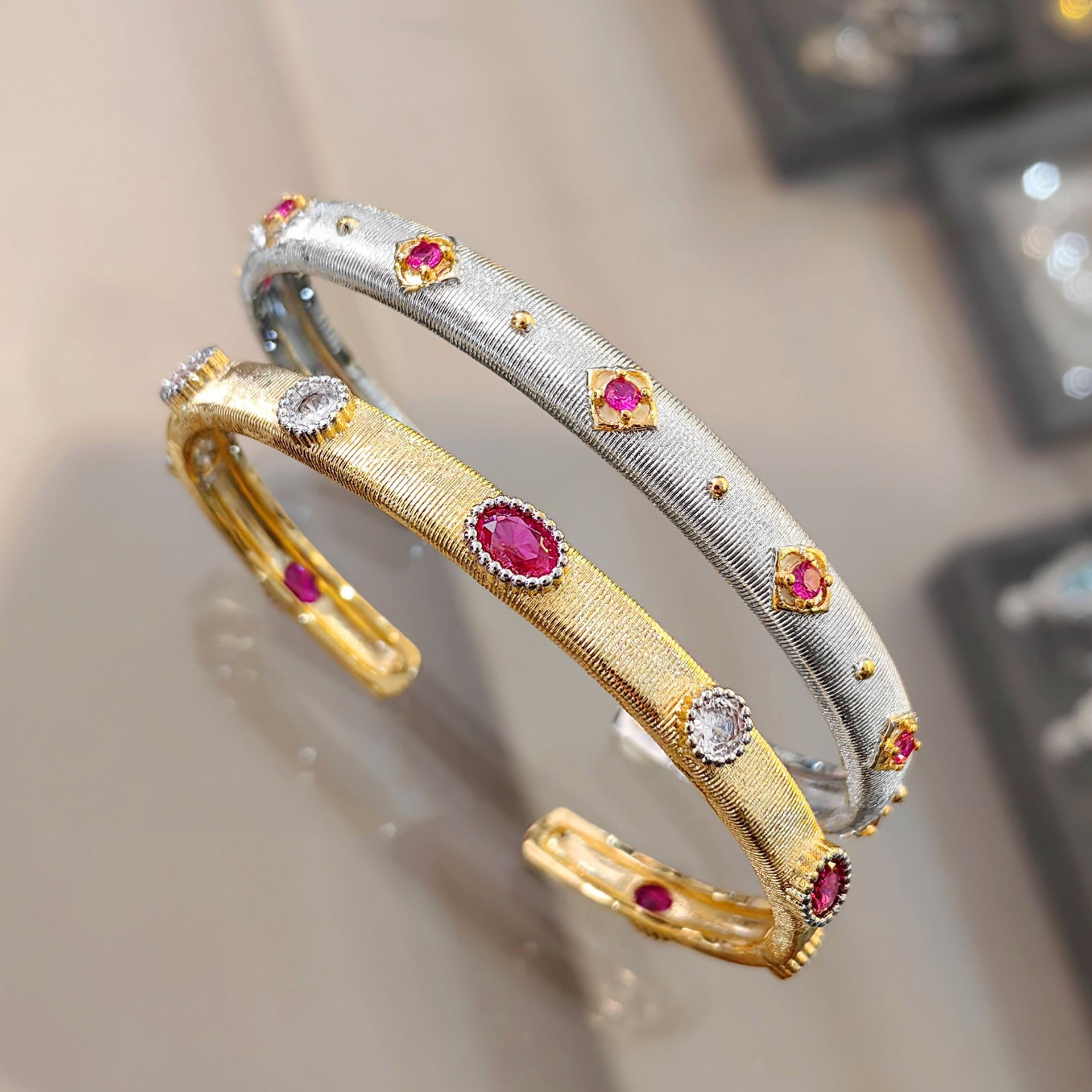 イタリアの布契の糸の工芸の紋様の彫刻の金の赤のコランダムのブレスレットはダイヤモンドの2色の金の指輪の狭い版の手環の女性を入れます。