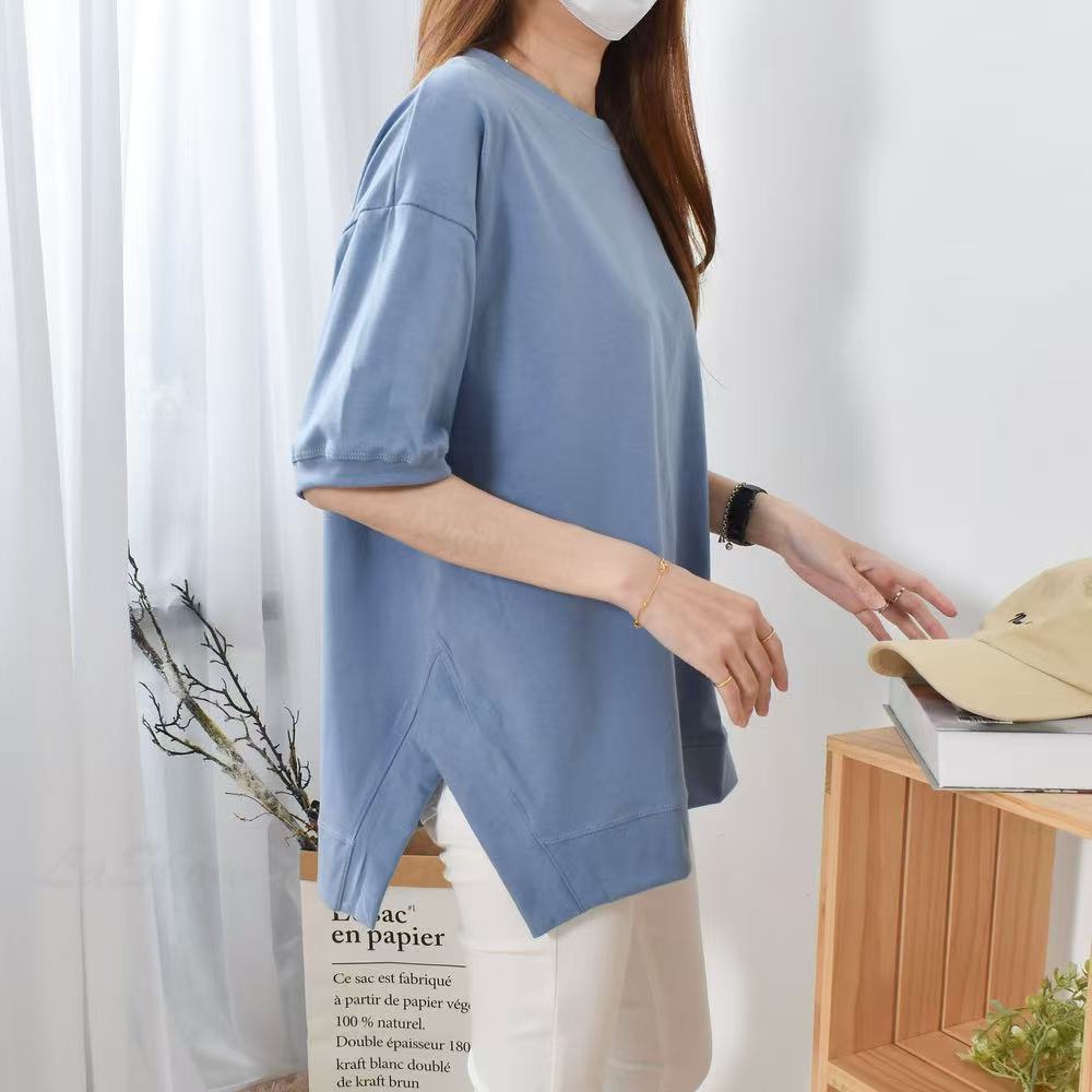 夏の新型の中袖の側の袋のゆったりした版の中の長いタイプの洋服の純色のシンプルな純色の女性のtシャツのカジュアルな上着