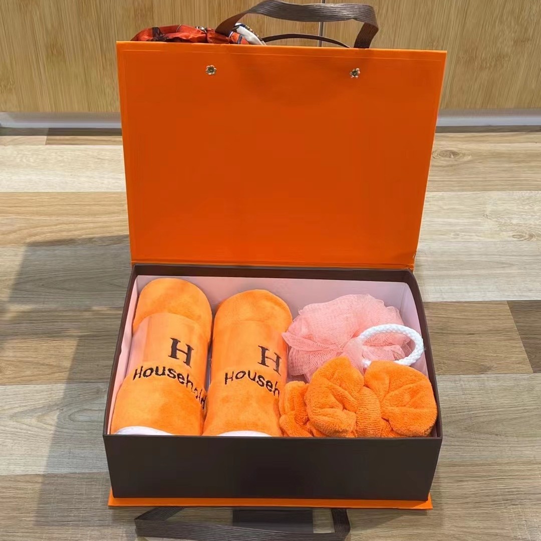 オレンジ色の大きなH字型タオル4点セットギフトボックス、家庭用38女神の日ギフト、コーラルベルベット