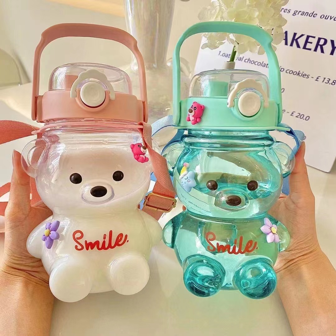 大容量の漫画の熊のプラスチックのコップのストローの子供の携帯は水筒のコップの量を背負って大量に優の卸売りに従います。