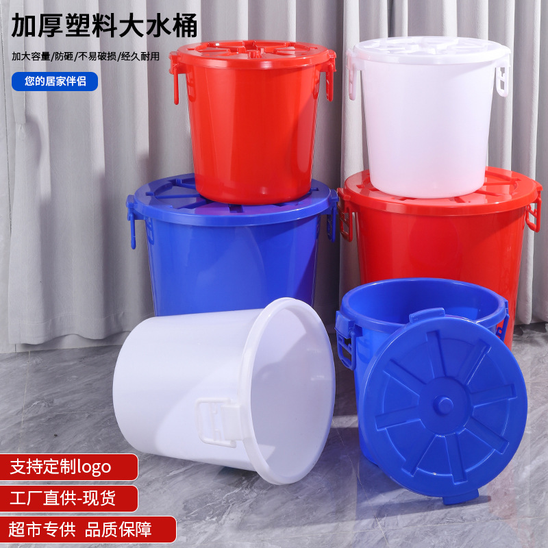 厚いプラスチックの白い桶の丸い蓋付きのプラスチック桶の貯水桶は酒造桶の台所でよく使われるプラスチックのゴミ箱を出します。