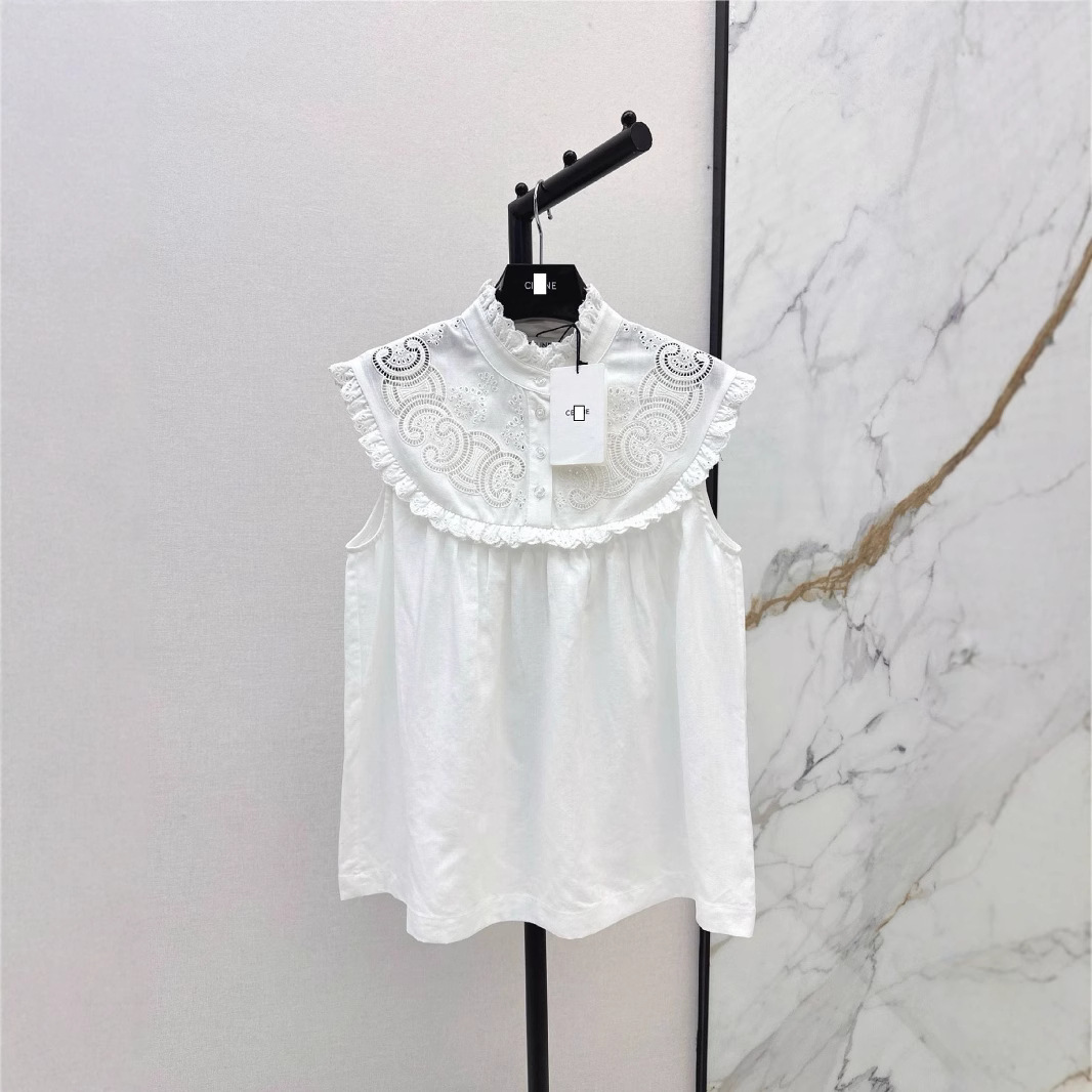 深圳南油2025春夏复古文艺风绣花花边小立领棉麻无袖衬衫