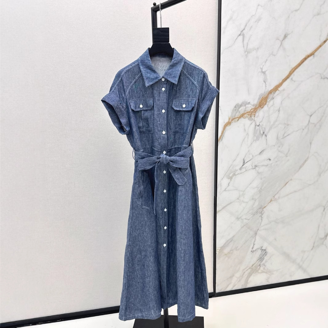 深圳南油25春夏高端女装气质亚麻翻领牛仔连衣裙